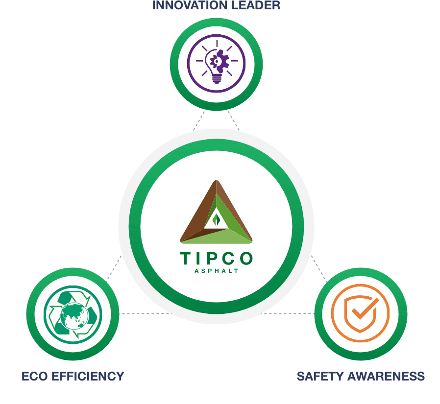 กลุ่มบริษัททิปโก้แอสฟัลท์มุ่งมั่นสร้างสรรค์พัฒนาโซลูชั่นนวัตกรรม เพื่อจัดหาวัสดุ และบริการที่เหมาะสมกับการก่อสร้างและซ่อมบำรุงถนน โดยคำนึงถึงความปลอดภัย สิ่งแวดล้อม และร่วมพัฒนาชีวิตความเป็นอยู่ที่ดีขึ้นของสังคม โดยยึดหลักธรรมาภิบาลในการบริหารงาน เพื่อการพัฒนาอย่างยั่งยืน